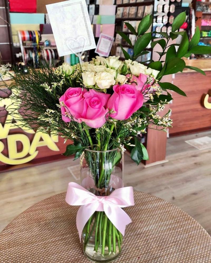 فازة ورد هدية باللون البينك من وردات هدية أنيقة تعبرعن مشاعرك مع خدمة توصيل ورد في الرياض.